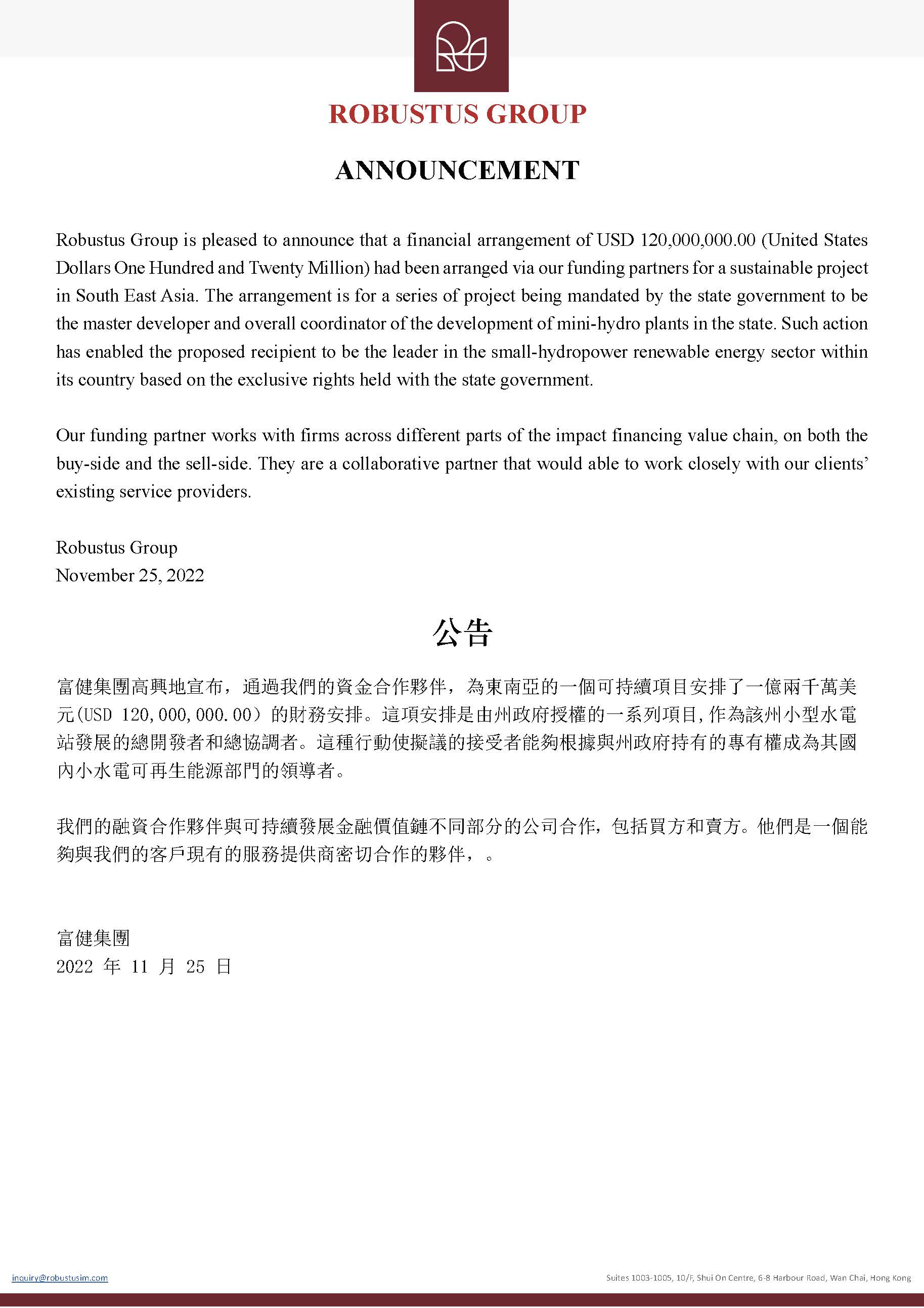 Robustus Group is pleased to announced a USD 120 Million funding arrangement.
