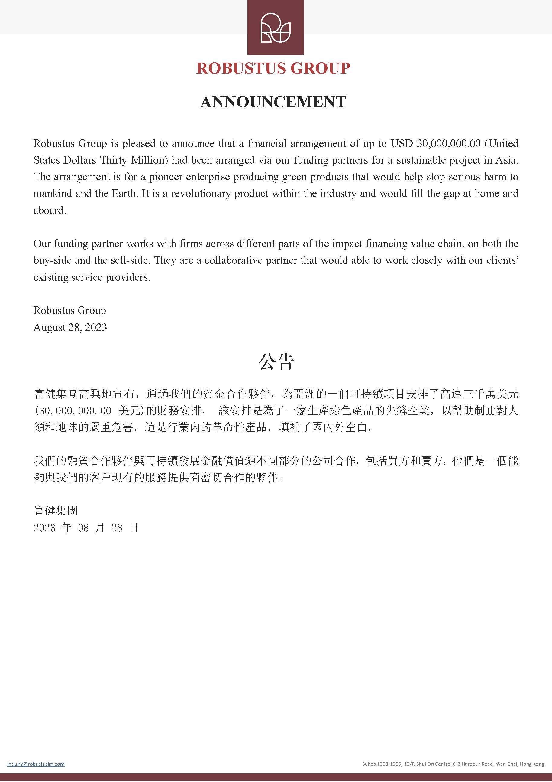 Robustus Group is pleased to announced a up to USD 30 Million funding arrangement for our client.